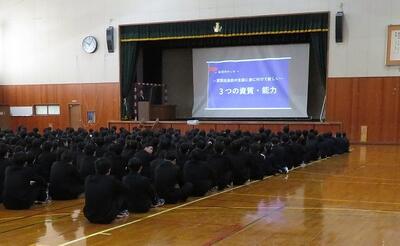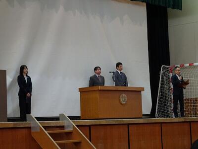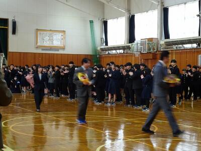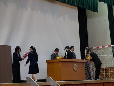 3月24日(火)今年度の修了式・離任式が行われました。修了式での校長講話、生徒指導部長の話の後、離任式で離任される教職員4名(1名は欠席)の最後のご挨拶の後、生徒会より花束贈呈がありました。卒業生も来校して、お世話になった先生方にお礼をして、お別れをしていました。